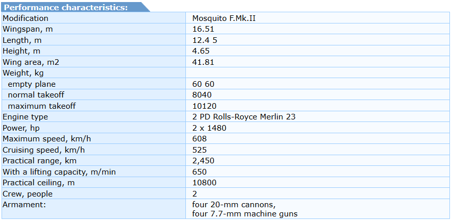 De Havilland designers were concerned that the fighter's stability would be unsatisfactory for night flights and in adverse weather conditions. Therefore, they decided to slightly reduce the fuel capacity (and range), thereby shifting the center of gravity forward. However, after brief testing, military pilots from Boscombe Down concluded that the W4052 was sufficiently stable for night flights if the aircraft's takeoff weight did not exceed 8,380 kg. This conclusion, to put it mildly, was not entirely consistent with reality. Even the company's test pilot was forced to note the insufficient longitudinal stability of the Mosquito, a fighter with a 680-liter fuel tank behind the guns, in a report dated July 5, 1941. Taking into account the opinion of customers, De Havilland did not take any steps to eliminate the defect, except for slightly increasing the area and span of the horizontal tail (on bombers and reconnaissance aircraft - 7.71 m2 and 5.92 m, on fighters - 8.18 m2 and 6.32 m, respectively).