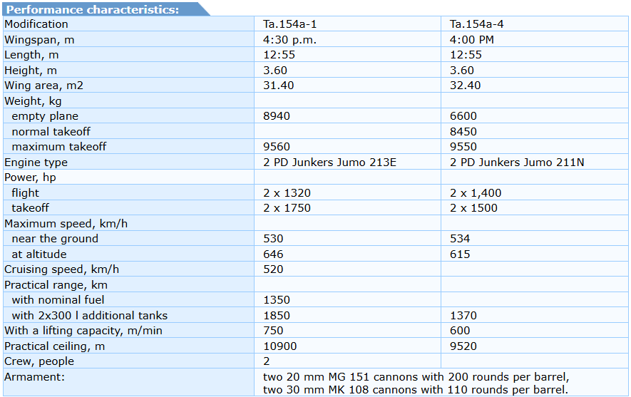 Soon, the second experimental Ta.154-V2 (TE+FF) was ready, featuring a FuG-212 "Lichtenstein" C-1 radar with four antennas in the nose. On November 25, 1943, the first experimental machines were joined by the Ta.154-V3 (TE+FG), also known as the Ta.154A-03/U1 and considered the standard for the series. It received Jumo-213E engines with a three-speed, two-stage supercharger, developing 1,750 hp at takeoff, 1,320 hp at 10,000 m, and 1,580 hp in emergency mode. Full armament was also installed. Despite a fairly significant increase in engine power, the maximum speed was reduced by 12% due to the additional drag of the antennas, gun ports, and flame arresters. Nevertheless, the flight performance was sufficient for an immediate order of 250 Ta.154A-1 fighters. The initial contract called for the production of 15 prototypes for testing. As a result, these aircraft received "ferzukh" numbers and pre-production designations. The Ta.154-V4 (TE+FH), which flew on January 19, 1944, was also known as the Ta.154A-04, and the V5 (TE+FI), which flew on February 23, was known as the Ta.154A-05. A total of seven initial aircraft were built in Langenhagen, the last of which flew in March. The remaining pre-production aircraft were completed in Erfurt. They differed from each other mainly in the shape of the radar antennas. The FuG-212 radar "mattress" on one of the prototype aircraft was replaced with a single antenna in the nose, while others were equipped with the "antler" antennas of the FuG-220 Liechtenstein SN-2 and a FuG-350 Naxos Z receiver radome above the cockpit. The equipment included a Revi-16B sight, FuG-10P and FuG-16ZY radios, a FuG-25a transponder, a FuG-101a altimeter, a FuBl-2 blind landing system, and a ReGe-6 radio compass.