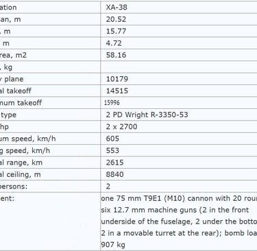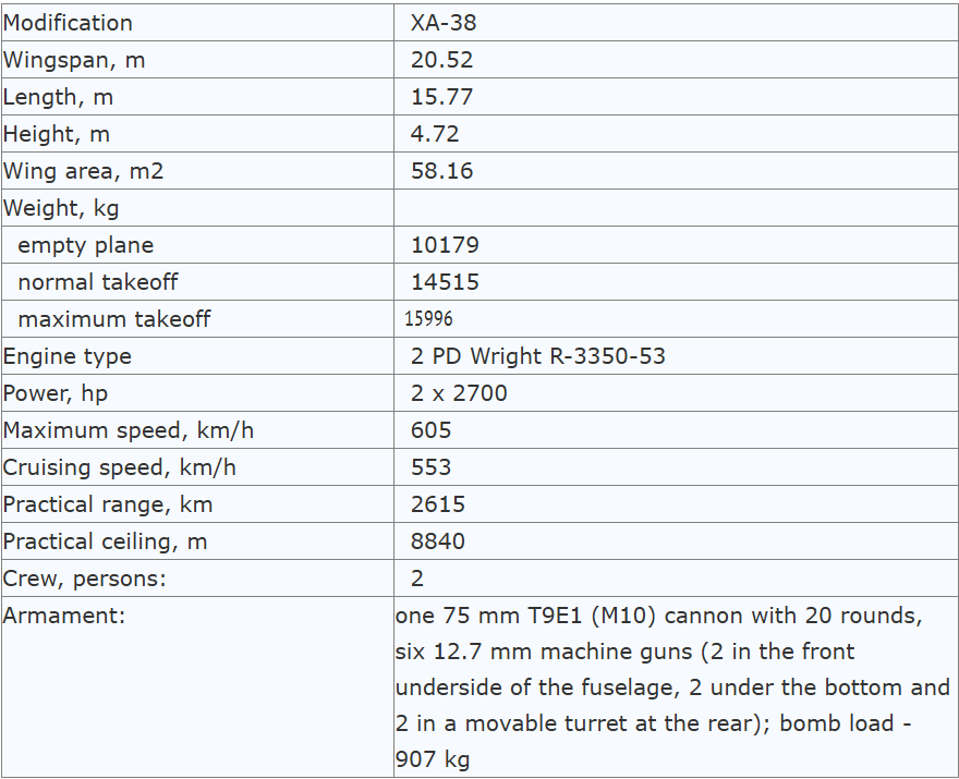 The attack aircraft's crew consisted of three: a pilot/radio operator, a weapons operator, and a rear gunner. With these parameters, the XA-38 was quite comparable to medium bombers of the time, but its primary mission was not considered to be bombing. The designers envisioned the XA-38 more as a heavy fighter-interceptor, since its powerful armament and high design speed would allow it to engage not only bombers but also enemy fighters.