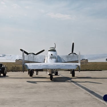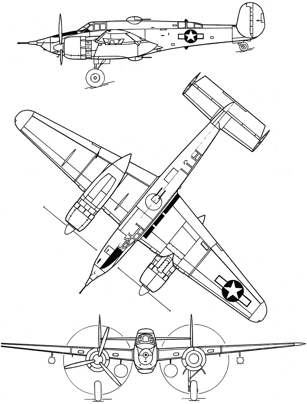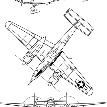 Wright R-3350-43 turbocharged engines (2,300 hp for takeoff) were mounted on the mid-wing. The single-wheel main landing gear retracted hydraulically into the engine nacelles, while the tailwheel retracted into a dedicated compartment. To improve the gunner's visibility and ensure effective rearward firing, the tail unit featured a twin-fin design with two "washers."