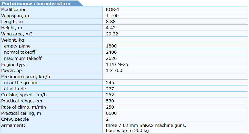 KOR-1 (on a wheeled chassis) - the tail section power set was reinforced with additional bracing straps. Additional struts were installed under the stabilizers. The engine cowling and the canopies of the pilot and observer cockpits were modified; KOR-1 (on ski chassis) - the general design was not changed. The skis were taken from the I-153 fighter;