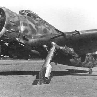 Another common bomb loadout option was 2-kg fragmentation bombs. The aircraft carried up to 168 of these munitions in four cassettes installed in the bomb bay. In this case, the "peas" were released upon exiting a dive while gaining altitude. On the second pass, the pilot "worked" the target with fire from four wing machine guns.
