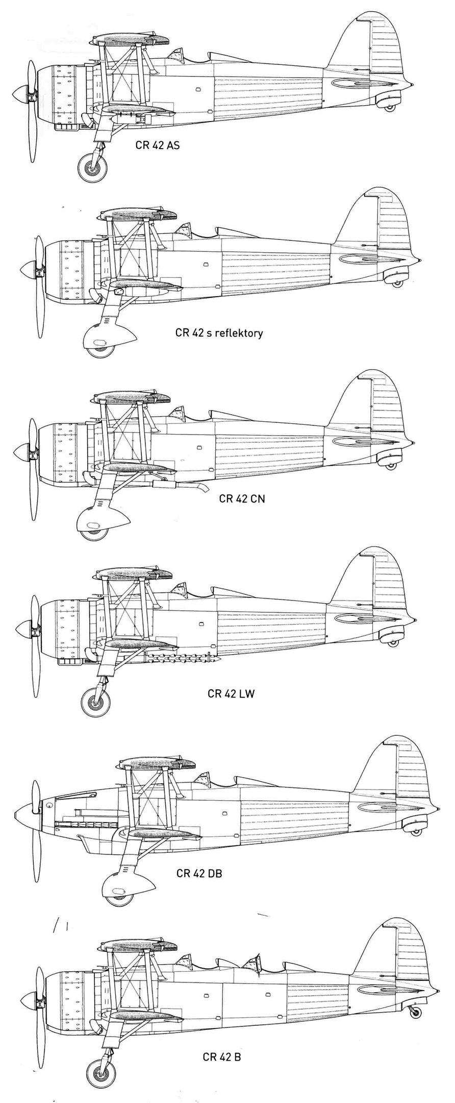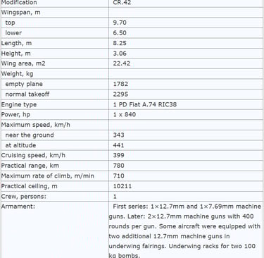 The installation of two additional machine guns in the lower wing root was necessary to somehow increase the fighter's overall salvo. The "forty-second" was retrofitted on assembly lines and directly at the units. CR.42s, designated "ter," were also produced with an armament of four SAFATOBs. They were intended, among other things, for battlefield support.