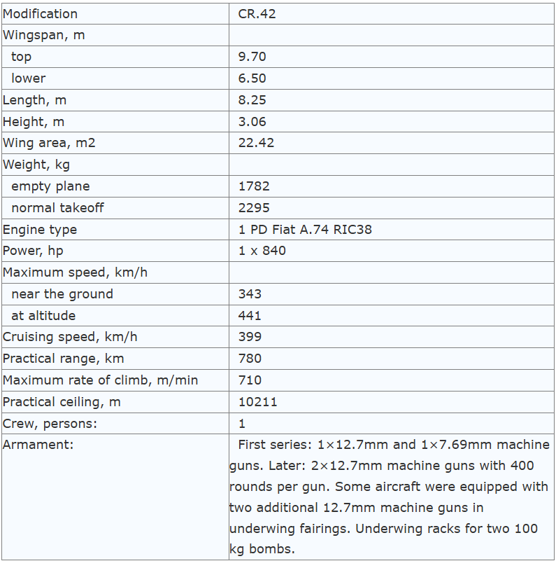 Serial production and modernization work on the Fiat was finally completed only in the summer of 1944. In total, taking into account prototypes, experimental models and machines intended for export, 1,782 CR.42 aircraft were produced (this is the maximum number cited by historians; according to other sources, slightly fewer were built, 1,710 units).