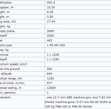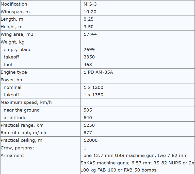 On February 22, 1941, after the first flight of MiG-3 No. 2115, it was discovered that of the total fuel capacity of 463 kg, 84 kg remained in the tanks (34 kg of which was unusable due to a design defect). Taking into account the remaining fuel in the forward fuselage tank (50 kg), the flight range was 820 km.