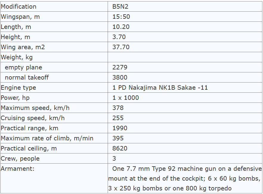 From the start of its service, work on improving the characteristics of the B5N1, as with any military aircraft, continued, and in December 1939 a new model (B5N2) appeared, equipped with a two-row radial 1000-horsepower Nakajima Sakae engine with a smaller cowling.