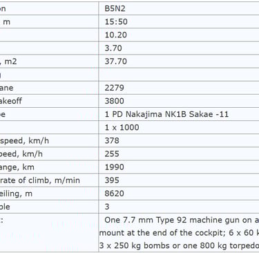 It is interesting to compare the Japanese armament with that of other navies. The trio, A6M2 ("Zero"), D3A1 ("Val") and B5N2 ("Kate"), closely matched the contemporary USN equipment of F4F-3 Wildcat, SBD-3 Dauntless and TBD-1 Devastator; Although, with the possible exception of the Dauntless, the Japanese aircraft had the advantage in performance. The British Fleet Air Arm, after years of neglect, was hopelessly outclassed by its Fulmar, Skua, and Swordfish, which, despite all their remarkable achievements, could not hope to survive the Pacific War. Interestingly, by 1943, to even the balance, the Americans adopted the F6F Hellcat, SB2C Helldiver, and TBF Avenger. However, the Zero was never replaced, and the B5N2, now very slow and vulnerable, remained in combat units until the summer of 1944. Work to replace the B5N2 at Nakajima resulted in the B6N1 Tenzan ("Heavenly Peak"), which was ready for testing in March 1942. It was equipped with a large Nakajima Mamori engine producing 1,870 hp. Vibration problems with this engine forced its replacement with a Mitsubishi Kinsei, and the B6N2 (designated "Jill" by the Americans) did not enter service until the disastrous (for the Japanese) fighting in the Marianas in June 1944. In the subsequent Battle of the Philippine Sea, the Japanese carrier fleet suffered its final crushing defeat, and the remaining carrier-based aircraft were subsequently used only from land bases.